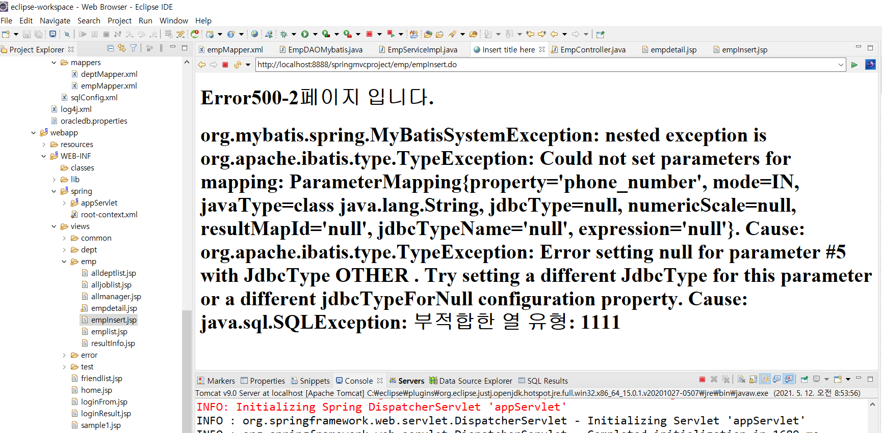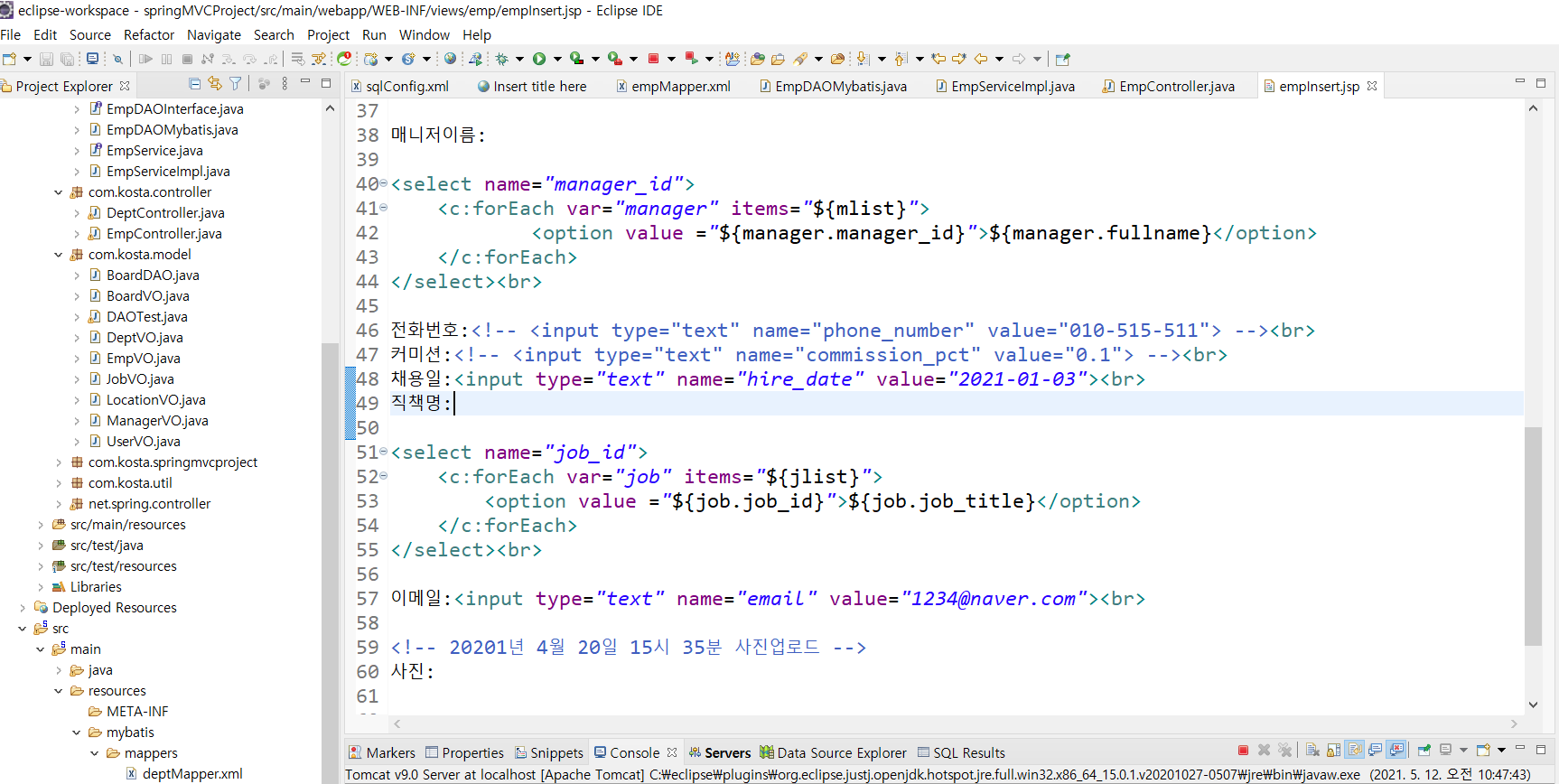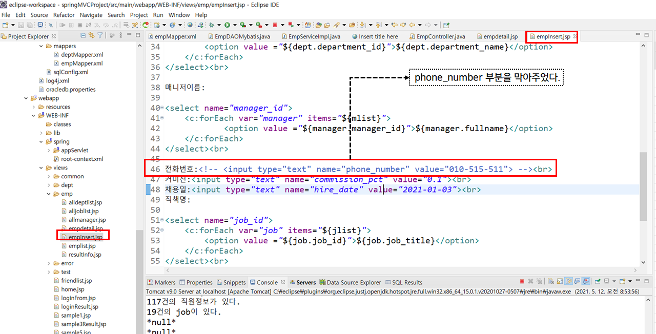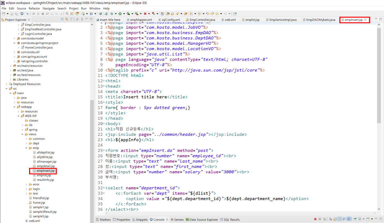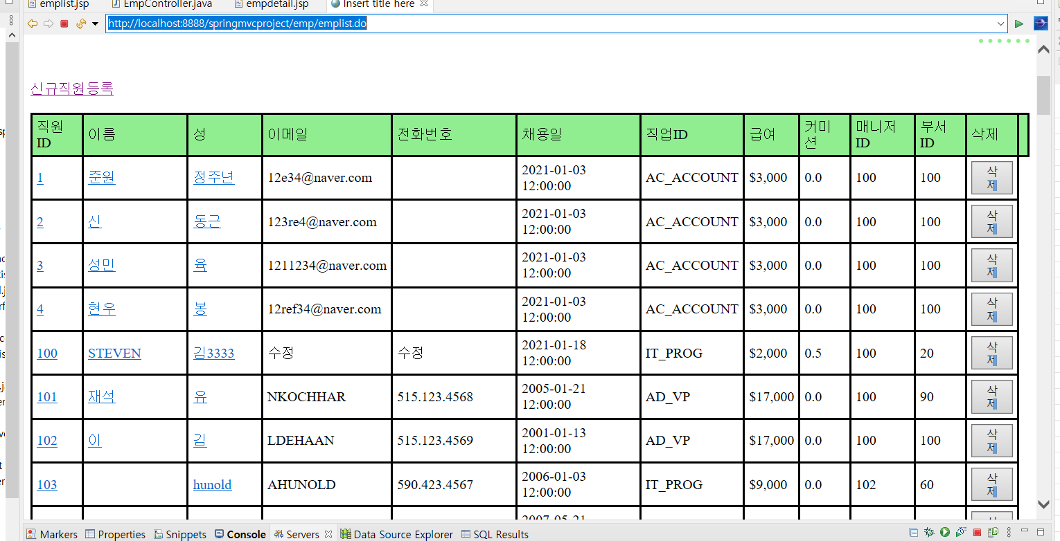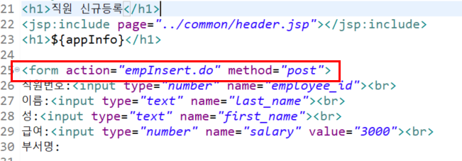 신규로 등록할 직원의 정보를 입력하고 input submit을 누르면 post방식으로 empInsert.do URL로 넘어간다.