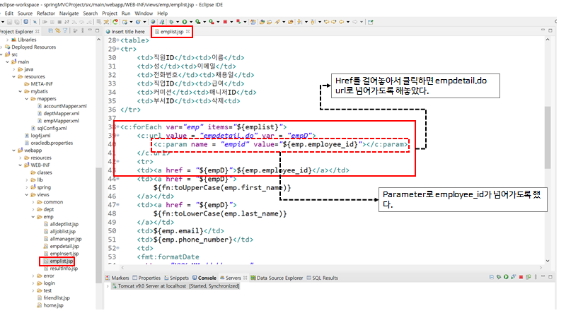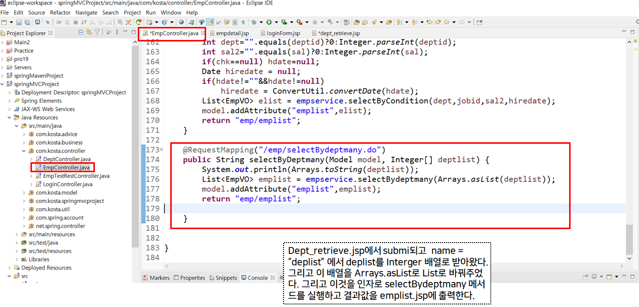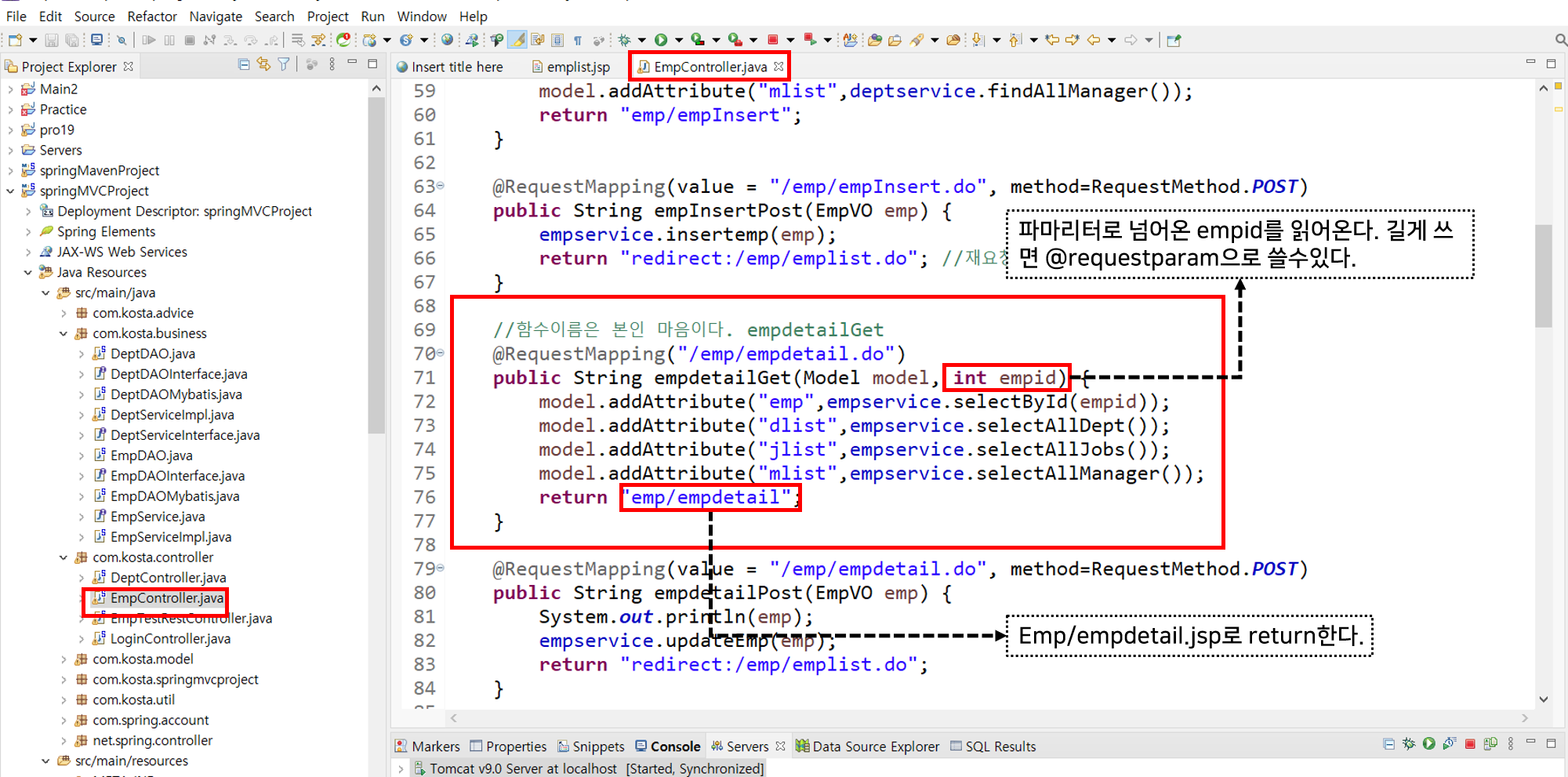form코드를 잘 살펴보면 아래에 action= empdetail.do로 되어있어서 Submit이 실행되면 post방식으로 empdetail.do로 넘어가도록 되어있다.