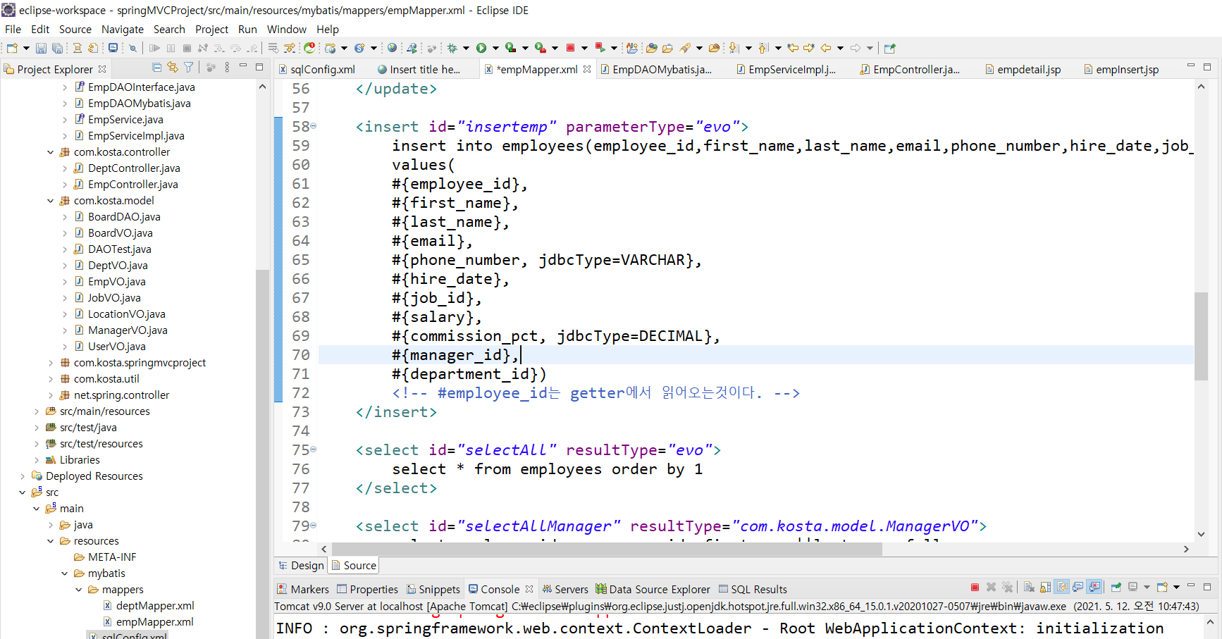 EmpServiceImpl.java이 EmpDAOMybatis.java에 연결되어 있어 empDAO.insertemp를 하게되면 EmpDAOMybatis의 insertemp메서드가 실행된다.