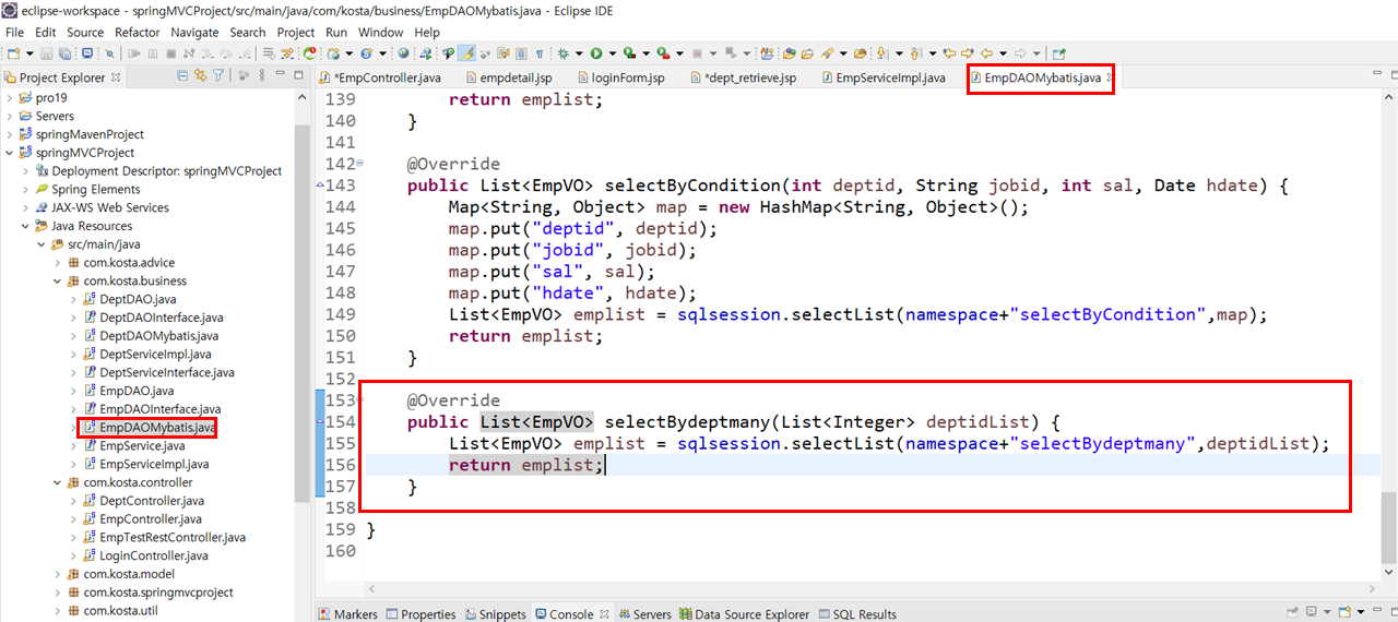 empservice.selectBydeptmany 메서드의 흐름은 아래와 같다. 먼저 service로 가고 해당 메서드 찾는다.
