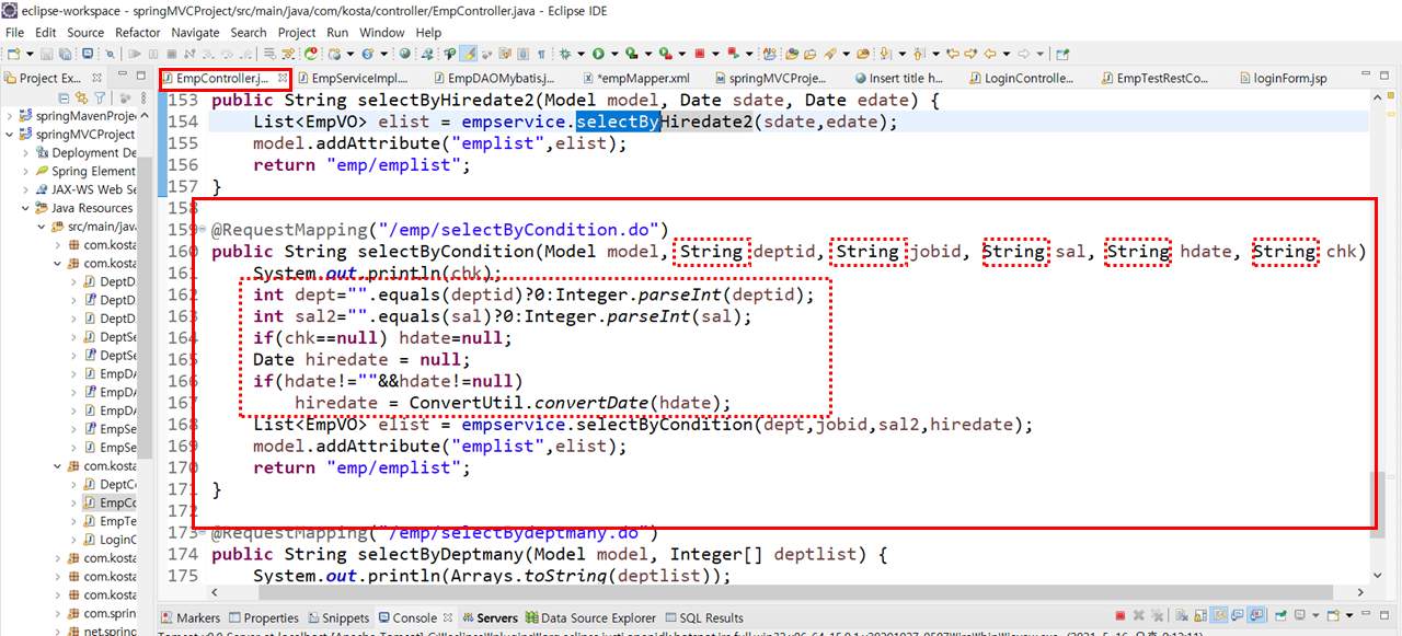 이제 Empcontroller를 보겠다. 잘 보면 파라미터로 form에서 받아올때 모두 String을 받아오게 했다. 왜냐하면 받아올때 입력하지 않으면 에러가 나서 넘어가지 않는다. 그래서 일단 String으로 모두 받아오고 null이 아니면 해당되는 타입으로 변환하여 service메서드의 매개변수로 넘기도록 했다.