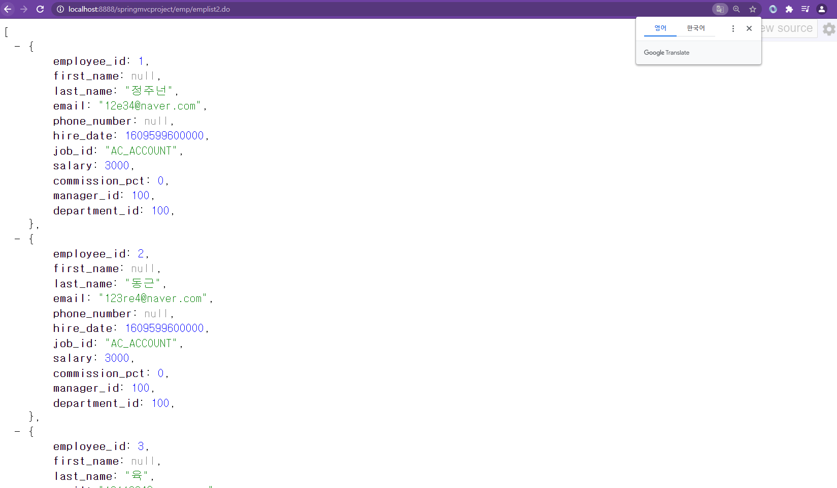 @RestController는 Controller+ResponseBody이다. emp받아온 것을 전에 produces해주었던 것처럼 해주지 않아도 json으로 반환해서 표시해준다.