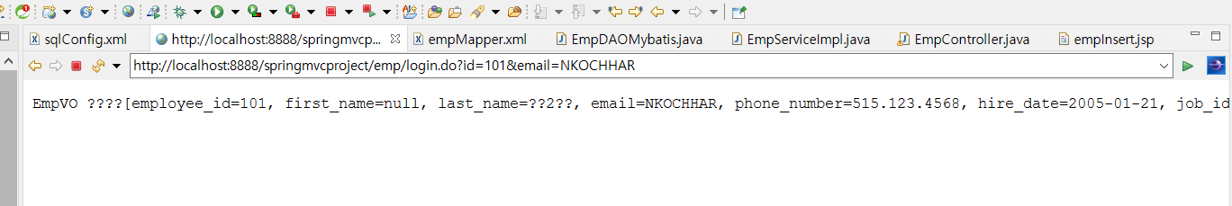 그리고 EmpController.java에서 아래와 같이 만들어주었다. return 으로 emp.toString으로 하고 @ResponseBody를 사용해서 별도의 jsp를 만들지 않고 결과가 출력되도록 만들었다.