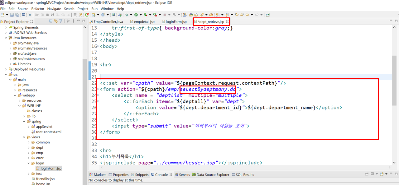 dept_retrieve.jsp아 아래와 같이 form이 있는데 select문이 multiple로 여러 값이 선택될 수 있다.