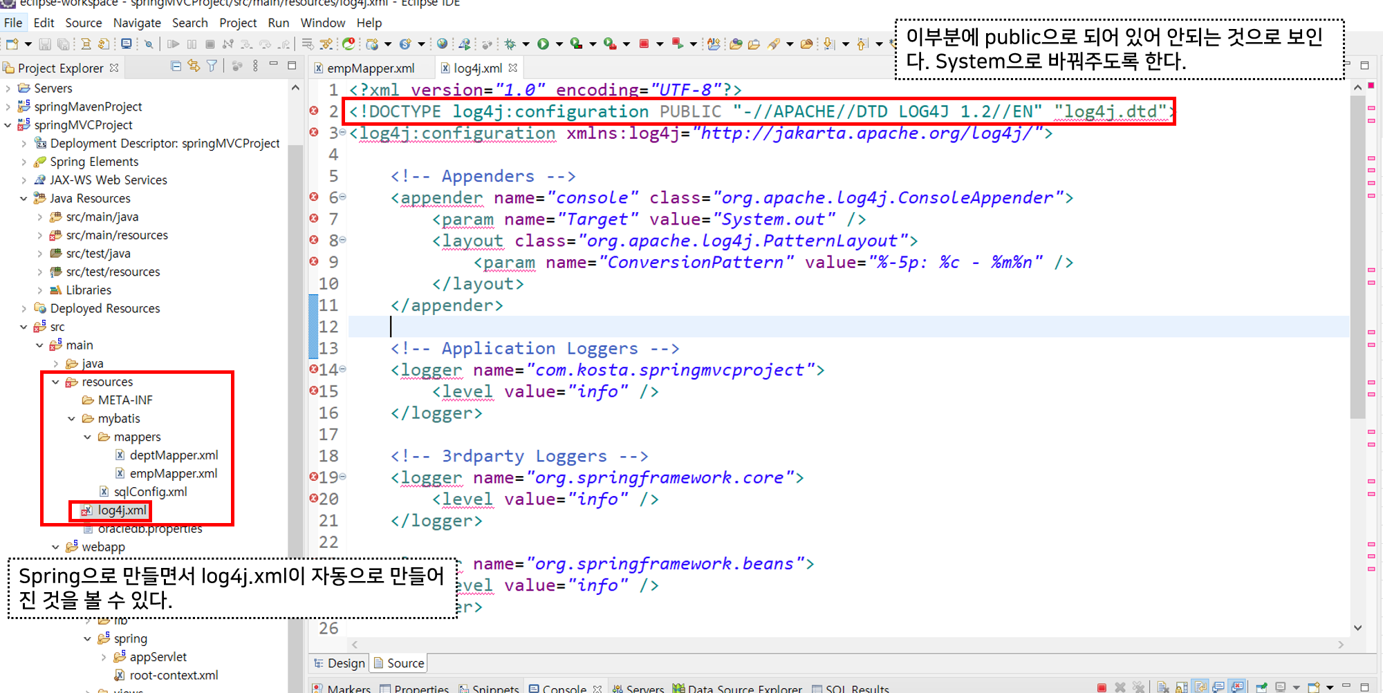 spring을 만들면서 아래 log4j.xml이 자동으로 만들어졌다. 그런데 x표시가 되고 있으므로 한번 살펴주도록 한다.