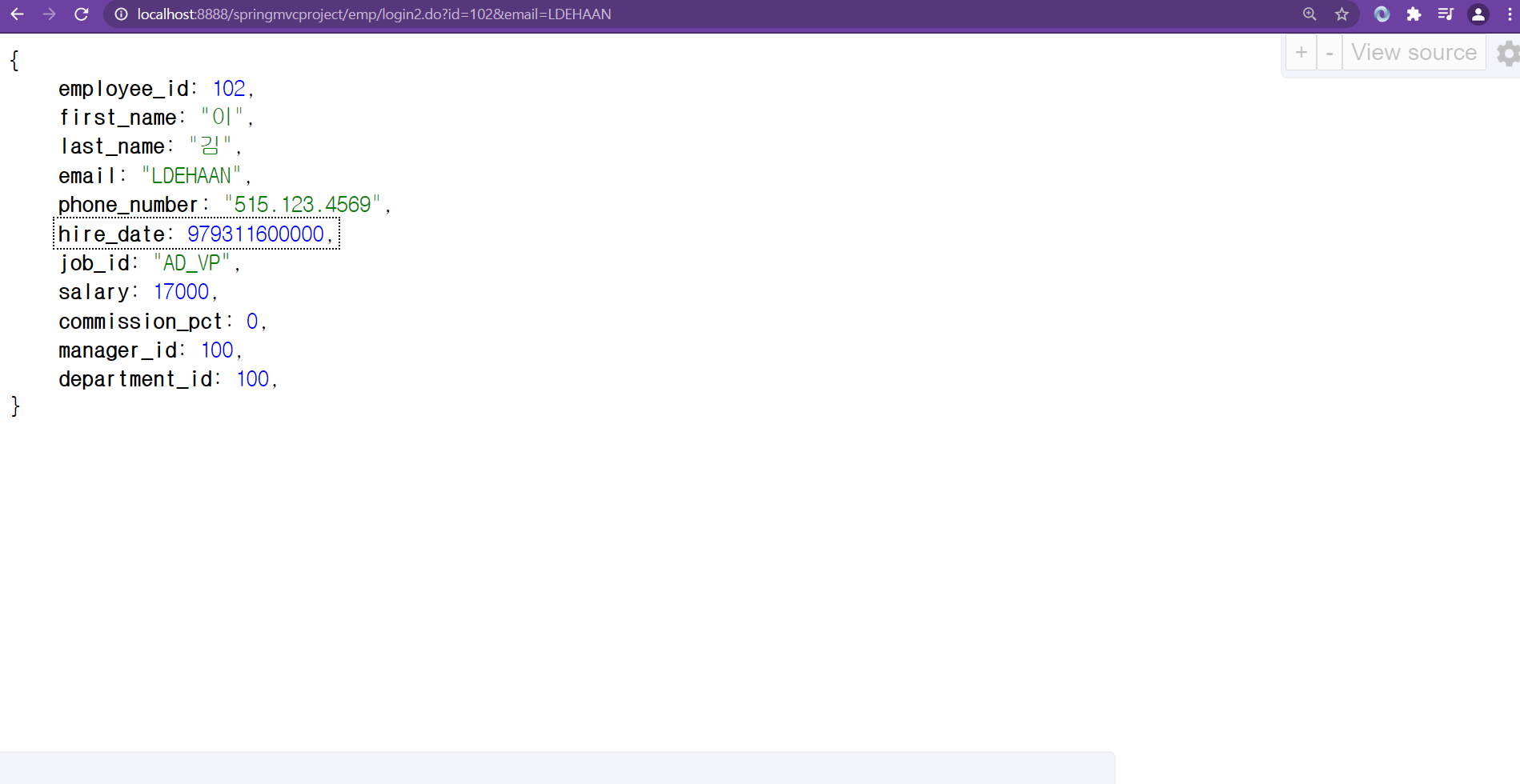 그리고 login2.do를 아래와 같이 파라미터로 id=102&email=LDEHAAN이라고 넣으면 아래처럼 JSON으로 잘 출력되는 것을 확인할 수 있다.