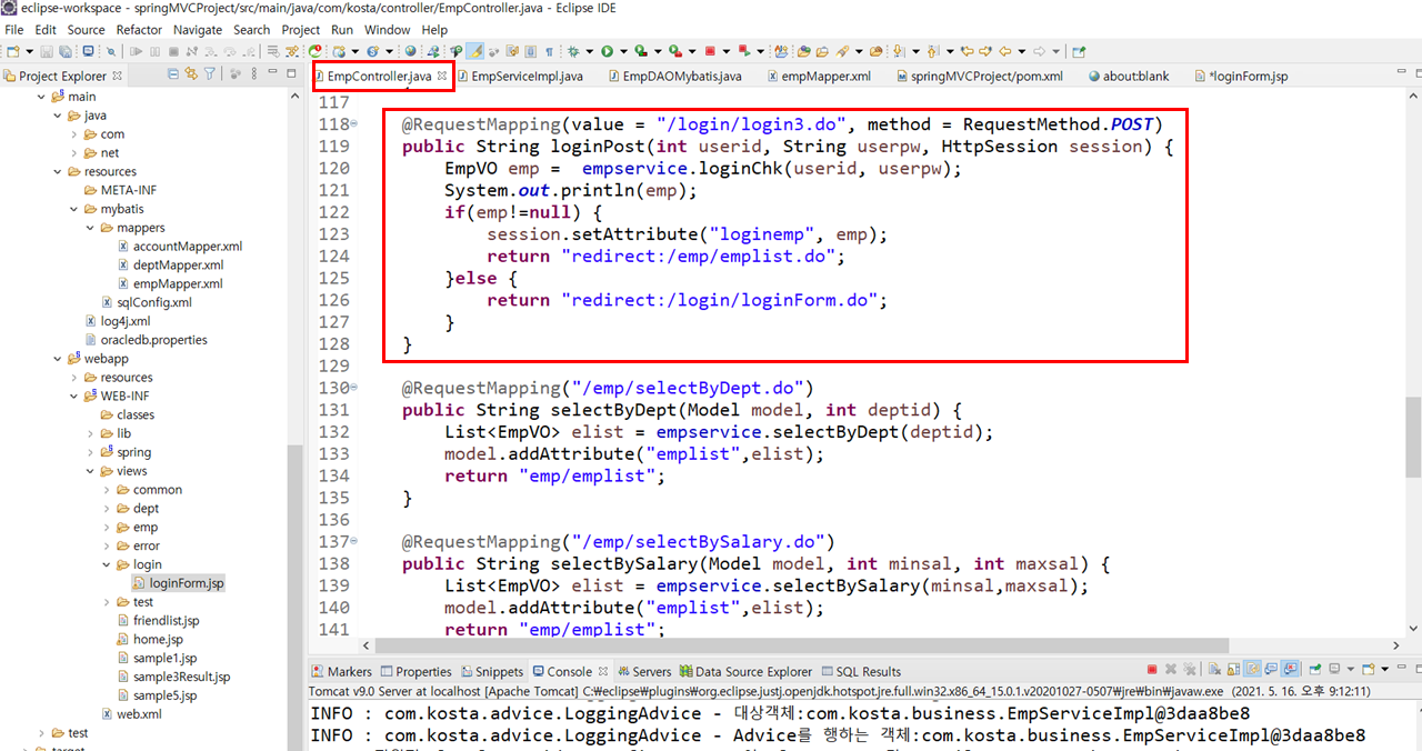 loginForm.jsp에서 로그인 버튼을 누르면 login3.do url로넘어가게 된다. 넘어간다음 loginChk메서드를 통해서 emp를 받아오는데 만약 일치하는게 있다면 emplist를 표시하게하고 없다면 loginForm.do로 돌아가 다시 로그인 하게 만들었다.