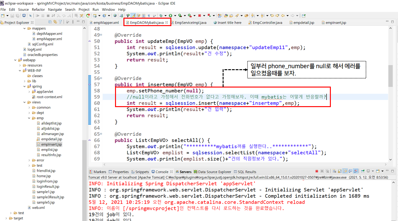 그러면 아래 처럼EmpDAOMybatis의 insertemp 메서드가 실행된다. 그런데 insert 될때 일부러 null값을 넘기도록 하기 위해서 emp.setPhone_number(null);이라고 해보았다.
