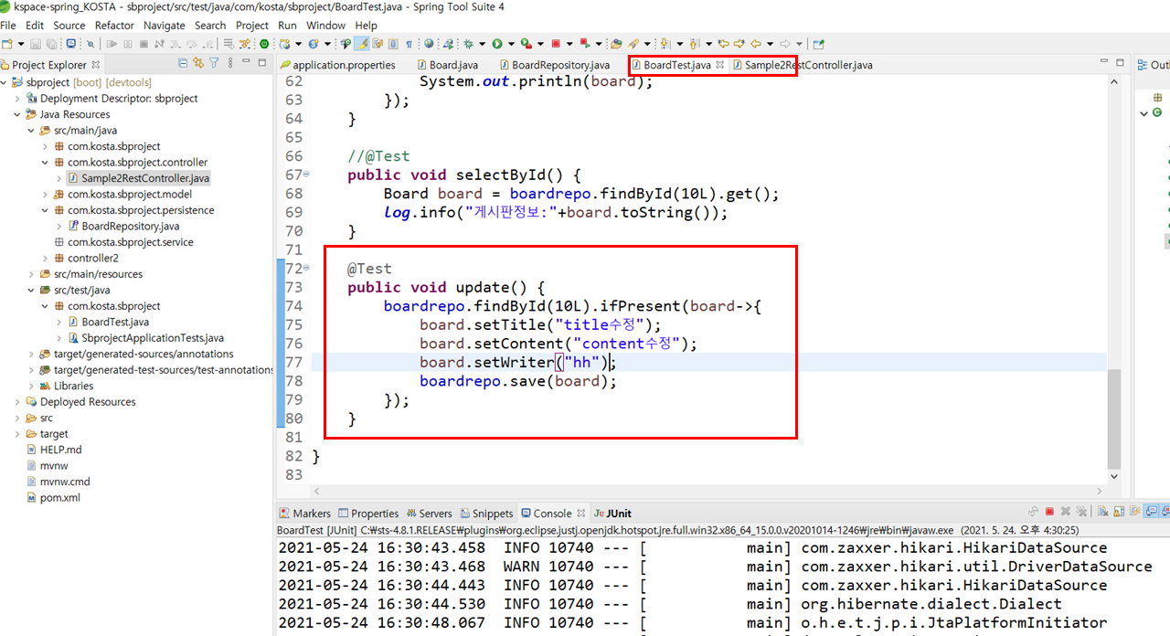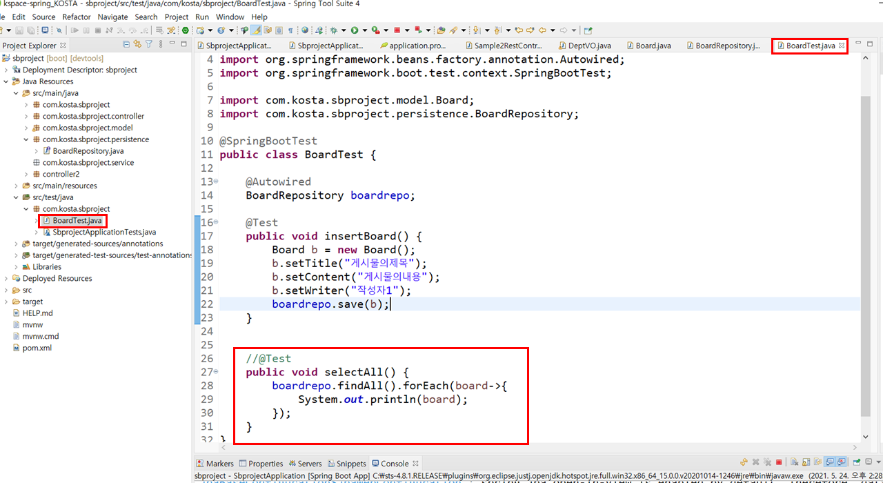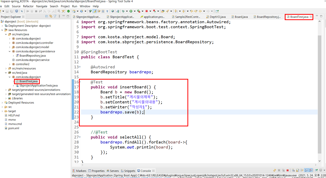 그리고 BoardTest 를 아래처럼 구현해주었다. 먼저 insert다. 이제 sql문을 사용하지 않고 DB에 데이터를 넣을 수 있다.