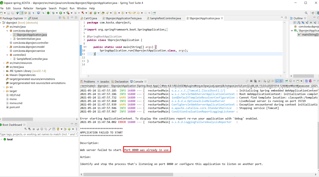아래 사진의 sbprojectApllication.java가 프로젝트 시작점이다.