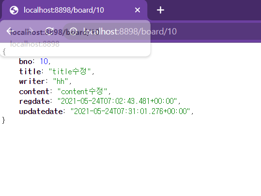 아래처럼 테스트를 해보았다. 페이지에서 json으로 해당 내용을 잘 표시하는것을 확인했다.