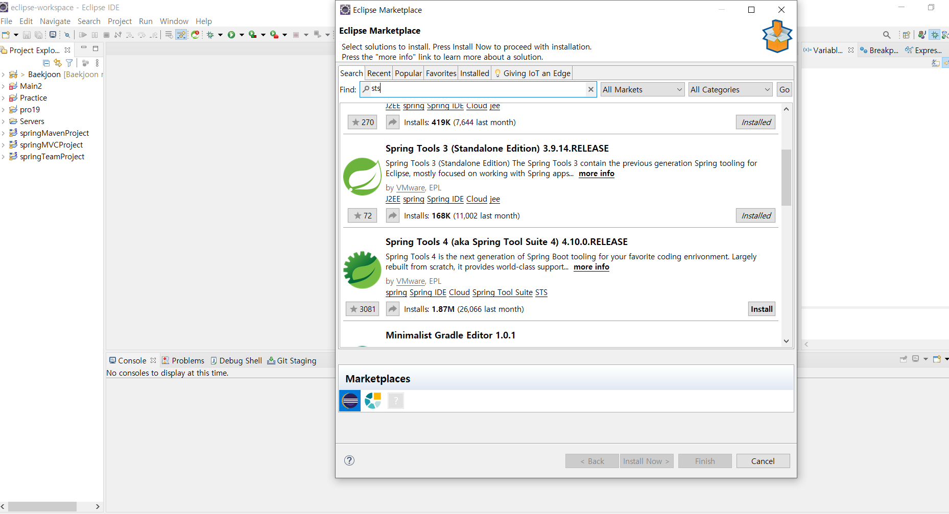 만약 Eclipse에서 스프링 부트를 사용하고자 한다면 아래사진처럼 Eclipse Marketplace로가서 설치를 해서 사용하면 된다. 우리는 먼저 STS를 이용해서 설치해보고 안되면 Eclipse에서 스프링부트를 사용하도록 하겠다.