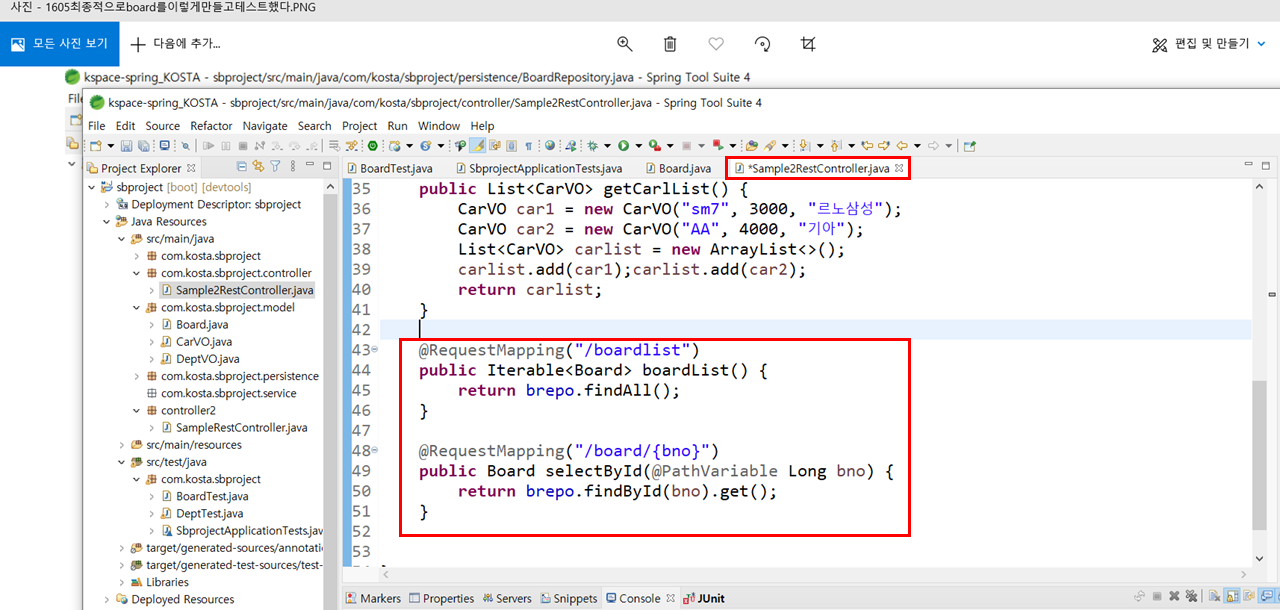 Sample2RestController에 아래처럼 RequestMapping을 해주었다. 웹페이지에서 /boardlist로 실행하면 json으로 값이 표시될것이다.