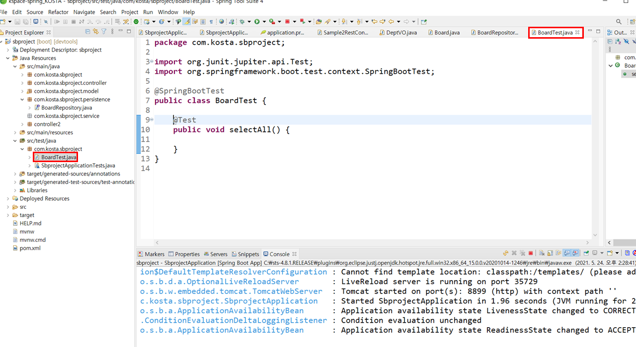 본격적으로 테스트를 하기전에 com.kosta.sbproject패키지 안에 com.kosta.sbproject.controller,com.kosta.sbproject.model,com.kosta.sbproject.service를 만들었다.