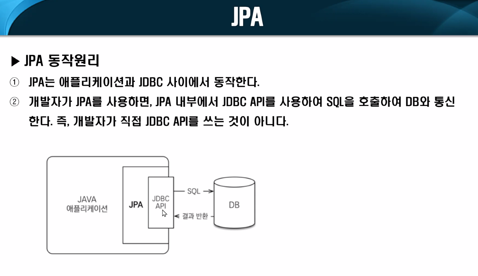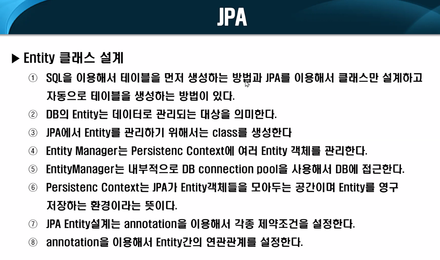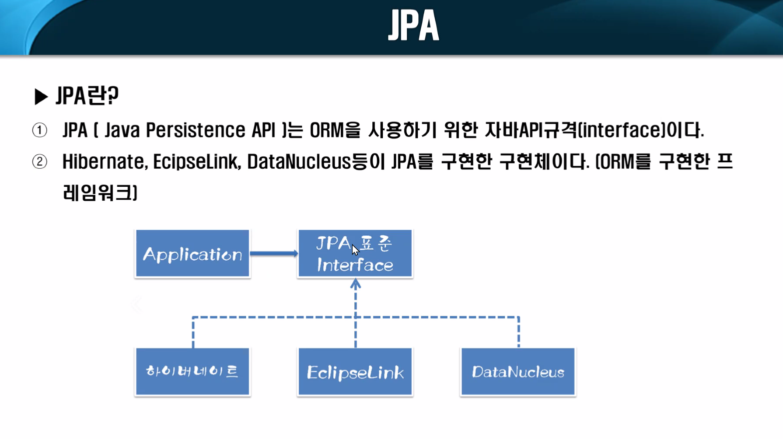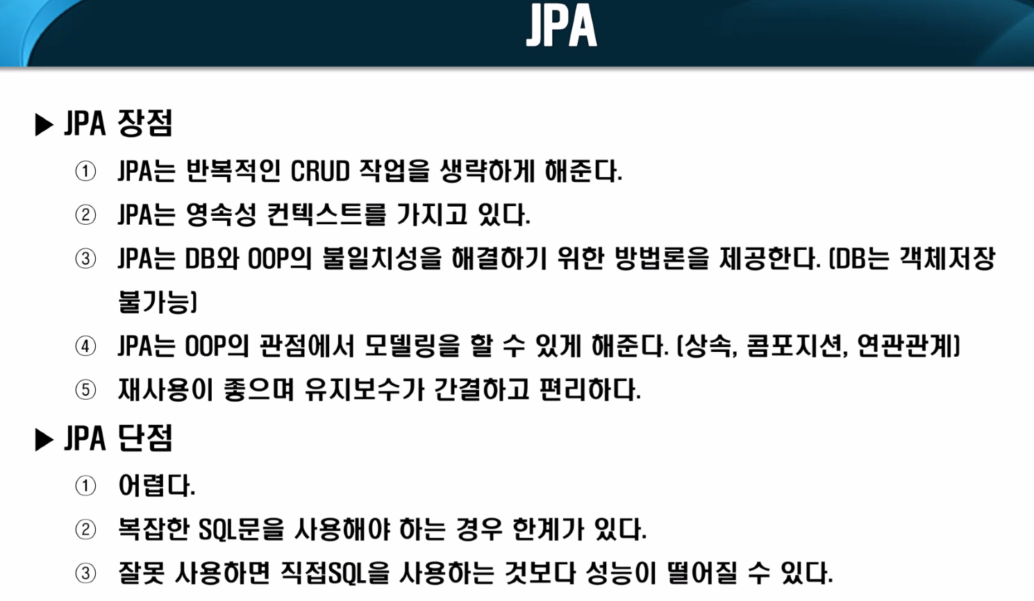 이번시간에는 jpa orm으로 들어가겠다. 자바객체와 SQL문을 분리할수 있고 SQL문을 직접사용하지 않고 직관적인 메서드를 사용한다고 한다.
