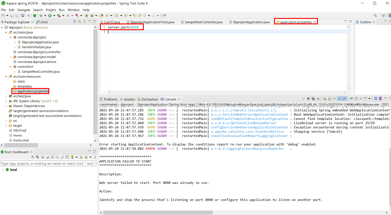 DB가 포트번호 8080을 사용하고 있으므로 포트번호를 바꿔줘야한다.