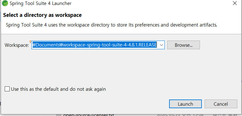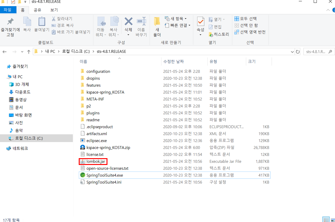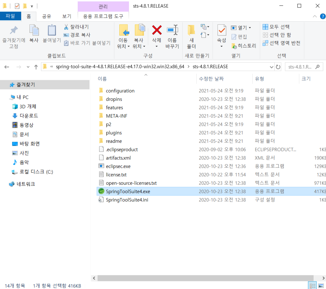 본인은 C:\sts-4.8.1.RELEASE 여기에 파일을 두었으므로 sts-4.8.1.RELEASE폴더까지 열고 클릭한다.