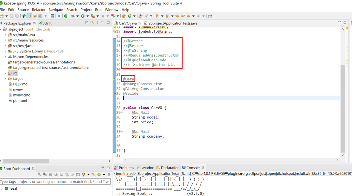 아래 CarVO를 만들때 @Getter, @Setter..등등을 사용했지만 @Data하나만 사용할 수 있다.